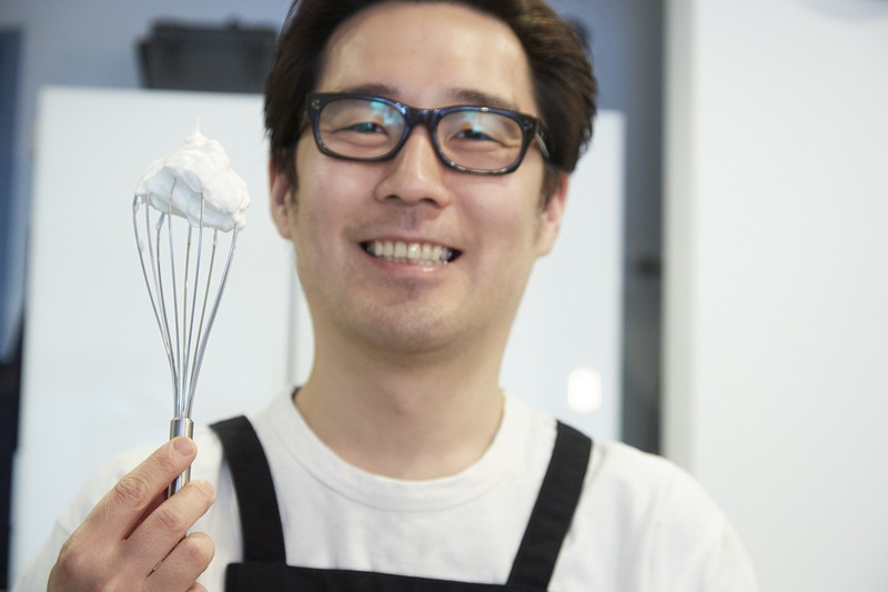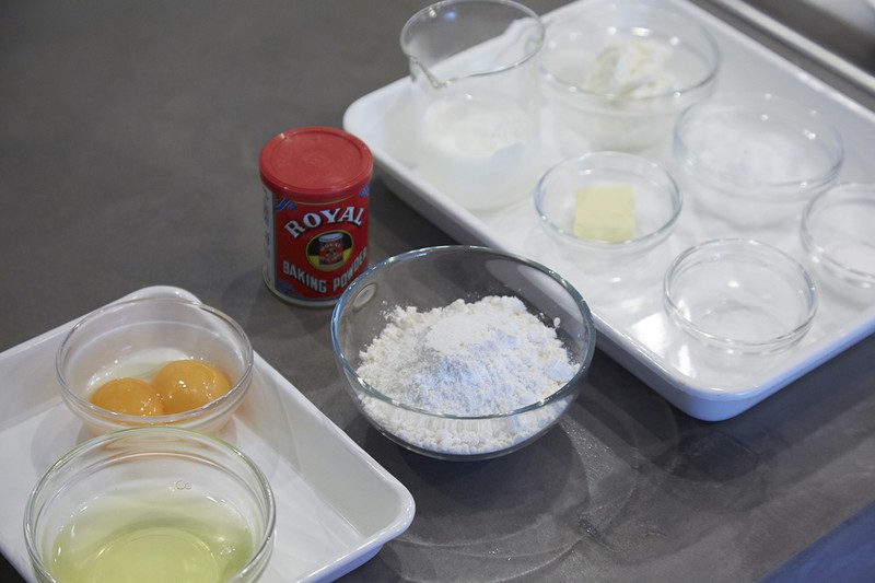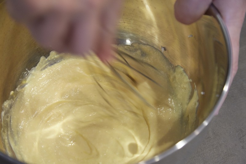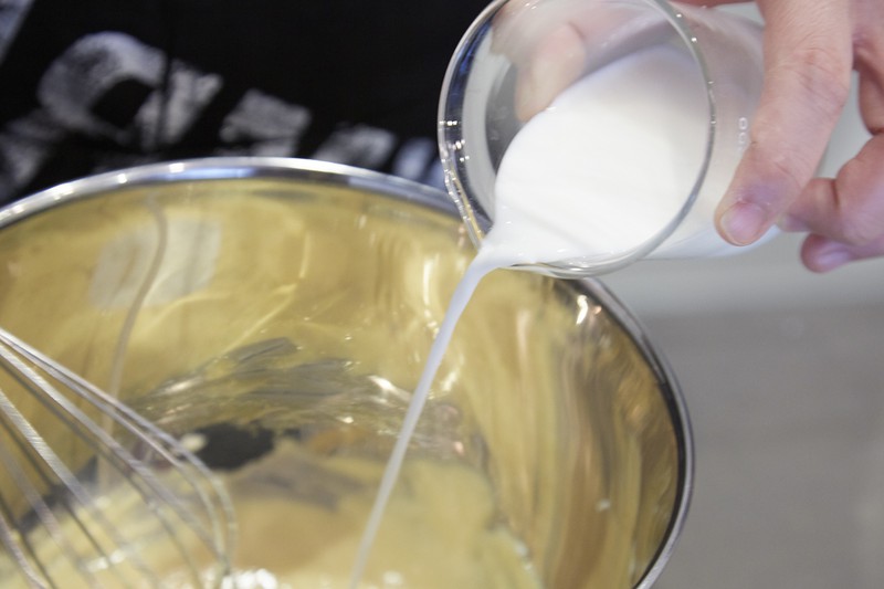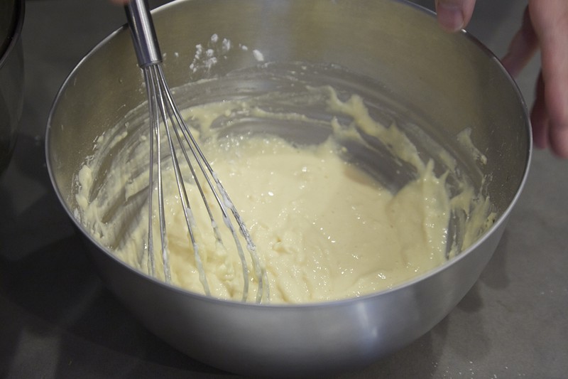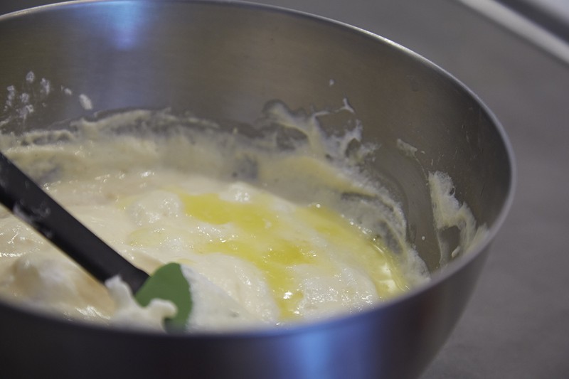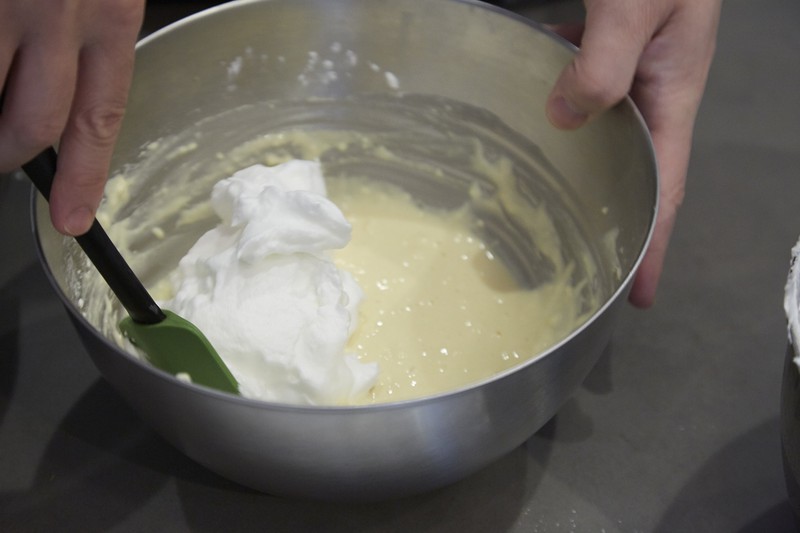 出来上がったメレンゲは、まず半量をさきほどの生地(卵黄、リコッタチーズ、ふるった粉を混ぜたもの)に加えます。このとき、1回ですべて加えないのは、せっかくフワフワに泡立ったメレンゲの食感を大切にするため。なので混ぜるときはあくまでさっくりと。混ぜすぎないように注意してください。