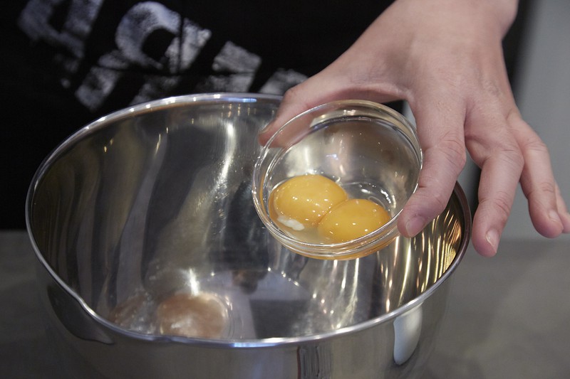 さあ、パンケーキの生地を作っていきます。まず卵を黄身と白身に分けます。