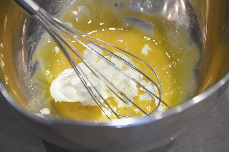 この卵黄をボウルに入れてほぐし、リコッタチーズを加えて混ぜます。さらに牛乳を加えてマゼマゼ。