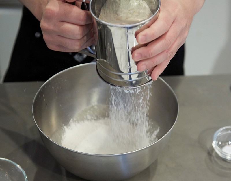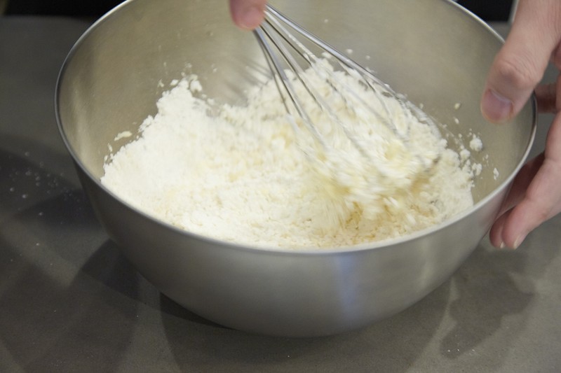 小麦粉とベーキングパウダーを合わせてふるい、さきほどの黄身とリコッタを混ぜたものに合わせて、さっくりと混ぜておきます。‟粉ふるい”を持ってない(普通は持ってないですよね?)方は、目の細かめなザルか茶コシなどで代用できます。粉を一度ふるうことでよりなめらかな食感のパンケーキになるので、このステップはできるだけ省略したくないところ。