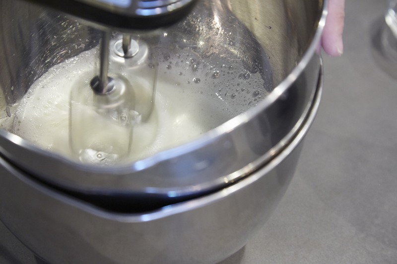 作るのはメレンゲです。卵の白身を2重にして冷やしたボウルで泡立てるわけですが、その詳細は「パブロバの作り方」を参照してください。要はしっかり冷やしたボウルで卵白をひたすらかき混ぜる訳です。電動ミキサーがあれば簡単ですが、無い場合はミキサーでガシャガシャ……筋トレのつもりで頑張ってください。