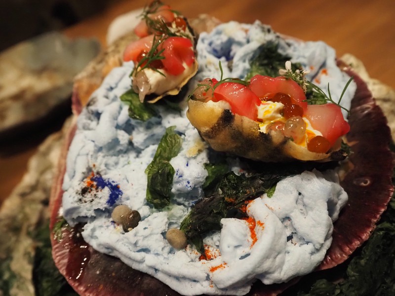 ▲ 生の魚介を使うのもNIKKEI料理の特徴。帆立、ハマグリなどの刺身にタピオカ状にしたポン酢をあしらって。