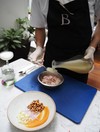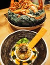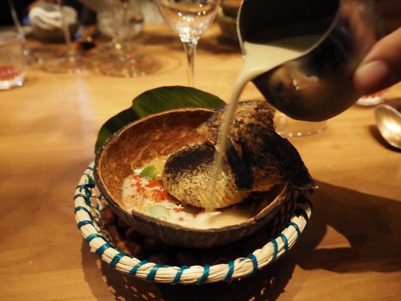 ▲ 蟹の出汁スープでいただく芋のヌードル。焼き石で調理を仕上げるのもペルー流。
