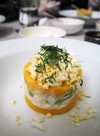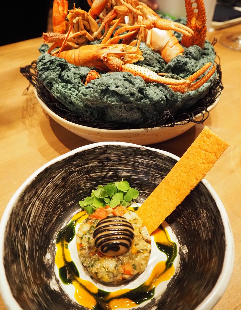 ▲ Camanác地方のOcoña川で取れる川海老と貝類のタルタル。