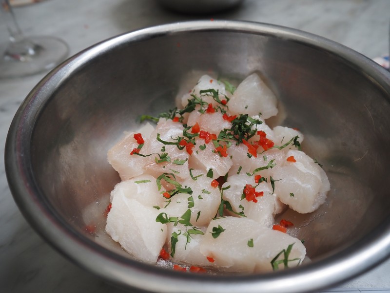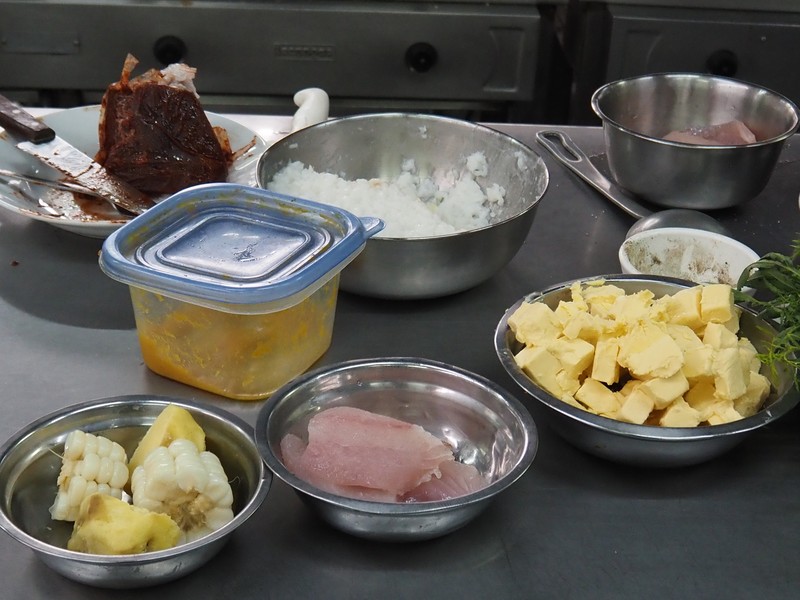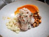 ▲ 出来上がった「セビーチェ」。付け合わせに茹でたトウモロコシと素揚げしたトウモロコシ、サツマイモのマッシュを添えていますが、まあ無くても大丈夫かと。