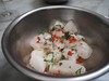 ▲ あらかじめ混ぜておいたライム果汁ベースのマリネ液に浸します。