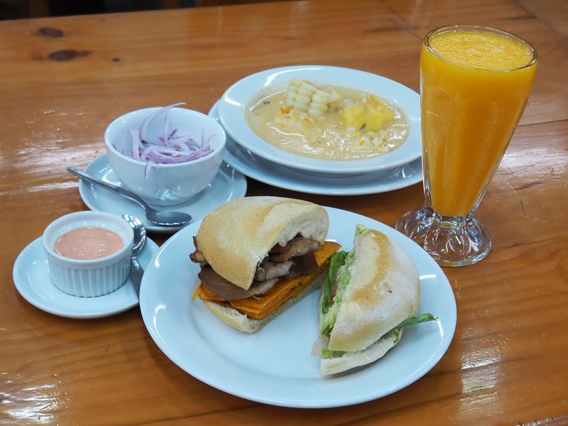 たとえば移動中に立ち寄ったドライブインの食堂で出会った魚のスープ「チュペ」。パンが溶け込み、ドロッとポタージュ状のスープには魚貝の濃厚な旨味が溶け出し、最高に美味でした。また、豚バラ肉を皮ごとカリッと揚げて、サツマイモの素揚げと一緒にサンドした「パン・コン・チチャロン」はリマを中心にペルーで愛されているサンドイッチの定番。「サルサ・クリオージャ」と呼ばれる紫玉ねぎとライムのサラダを加えて食すと、サツマイモの甘み、豚バラの塩味、サルサの酸味があいまって、食べ応えも抜群です。