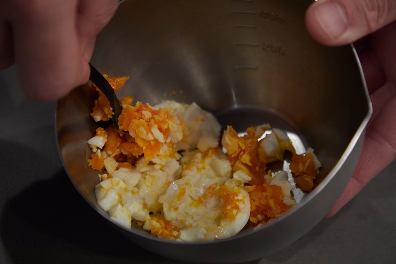 ▲ ゆで卵をボウルに入れ、フォークで潰します。