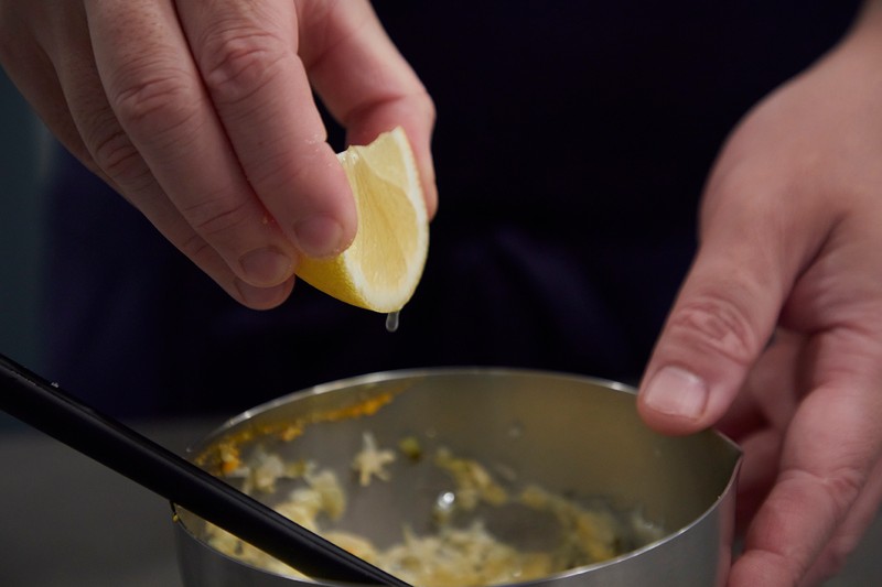 ▲ 塩、胡椒と砂糖を加え、仕上げにレモン汁をピッと。レモンを搾る際には、皮を下にすると種が落ちず、香りもより高くなります。