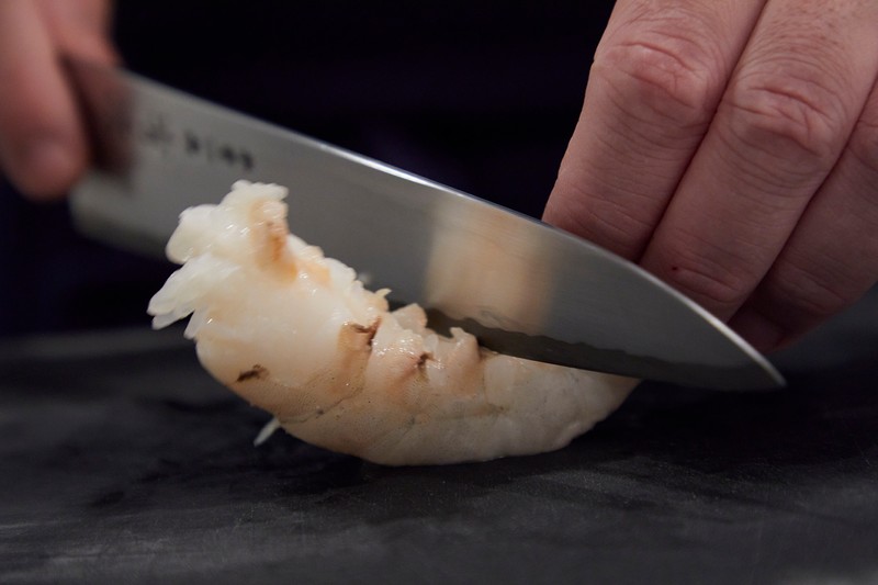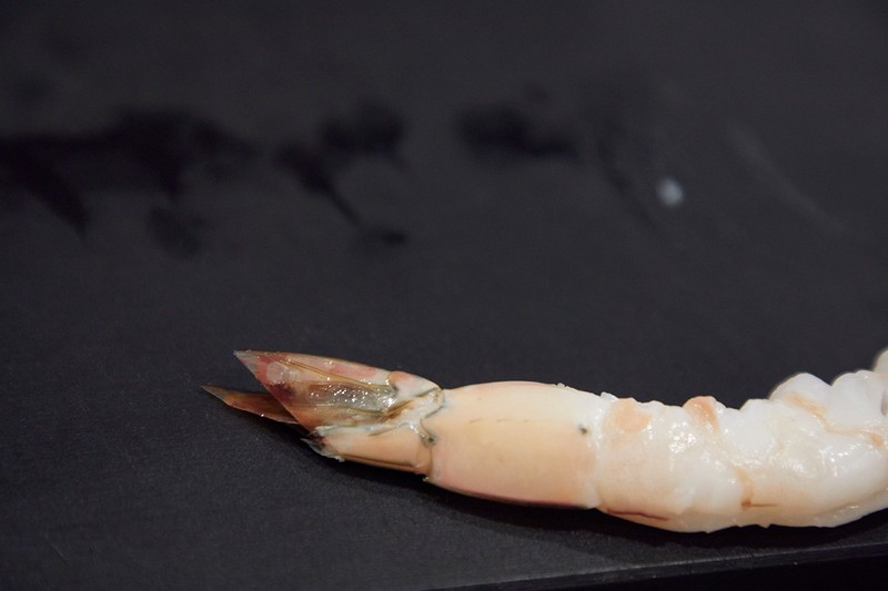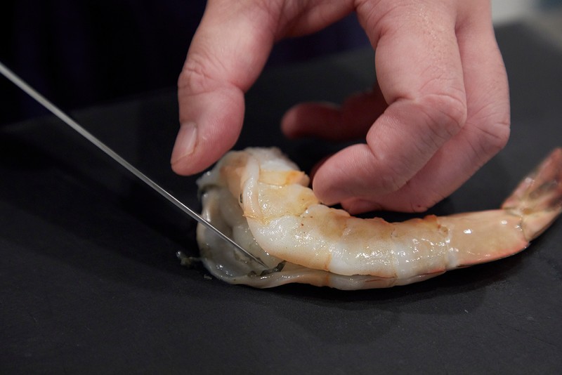 ▲ 背中に切り込みを入れると見えるこの黒い筋が背ワタ。ワタが無いエビもいます。
