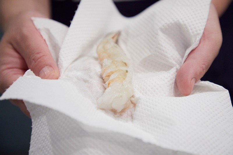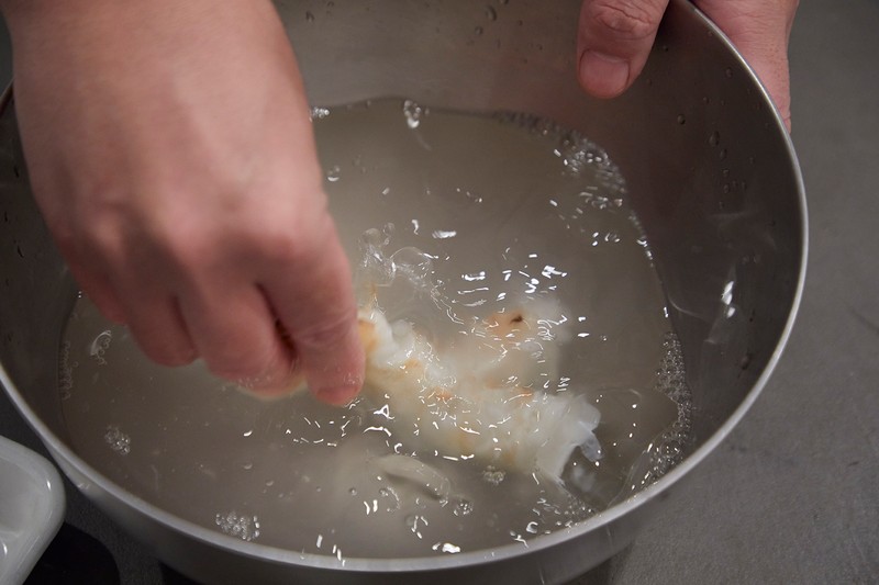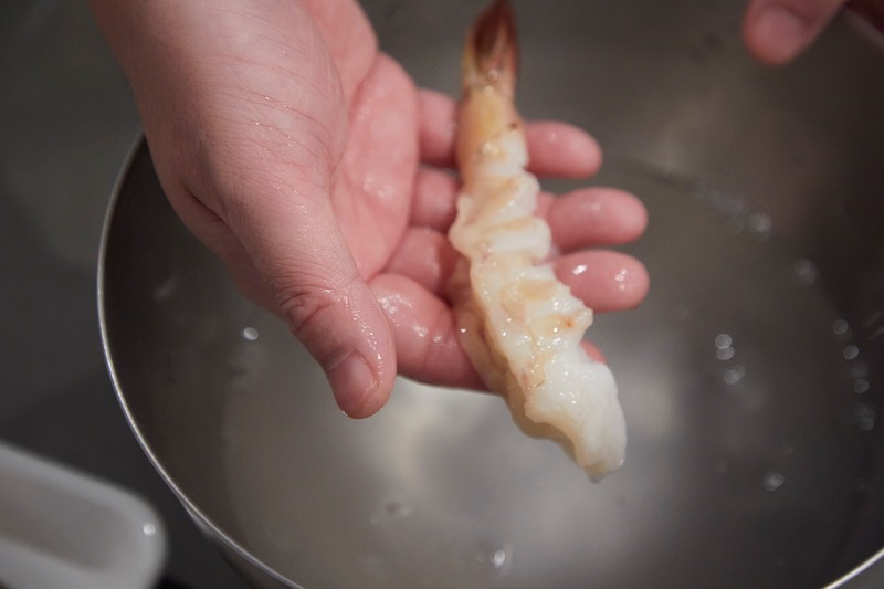 ▲ エビは尻尾側の節をひとつ残して皮をむきます。