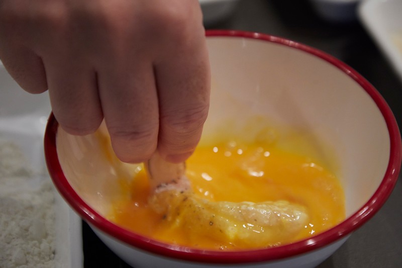 暑い日は熱い油を前にしたくないけれど、秋なら揚げ物もサクサク。先日教えてもらった「若鳥の半身揚げ」もおいしかったから、今日は何か違うものをつくっていただきたいなぁ。すると野本さん、「エビフライはどうですか?」って。