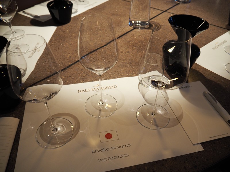 「Nals Margreid(ナルス・マルグライド)」は、アルト・アディジェの都市であるボルツァーノ近郊、ナルス村とマルグライド村の協同組合として1932年に創業したワイナリー。250軒以上の契約農家が約160ヘクタールの畑を管理し、標高200〜900メートルの多様なテロワールからブドウを収穫しています。白ではピノ・ビアンコやソーヴィニヨン・ブラン、赤ではラグレインやピノ・ネーロが高い評価を得ていますが、ことに「Sirmian」(上の写真右から2本目のピノ・ビアンコ)は素晴らしかった! 標高550メートルの石灰質土壌由来の酸とミネラルが特徴的で、多くの品評会でも賞を獲っています。ピノ・ビアンコとはピノ・グリなどと同様にピノ・ノワールからの突然変異で生まれた品種ですが、現在はアルト・アディジェDOC全体の約10%を占めているこの地域の代表品種。アルト・アディジェを知るためにまずは飲みたいワインだと、私も1本購入しました。