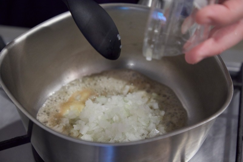 ▲ みじん切りにしたタマネギをバターで炒めます。あぁ、なんて幸せな香り……。