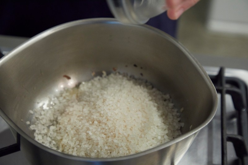 ▲ タマネギがしんなりとしたら、分量の米をざ~っと鍋へ。リゾットに使用する米は洗いません。気になる方は無洗米を使ってください。