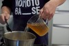 ▲ 米がブイヨンを吸い、汁気がなくなってきたら残り半量のブイヨンを入れ、さらに煮ます。