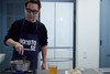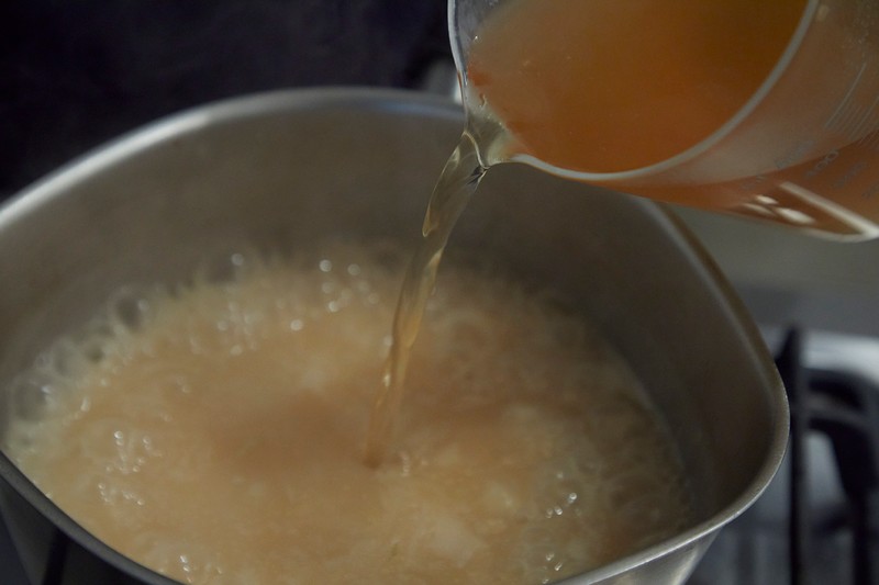 ▲ お米がバターを吸い、透明になったらブイヨンを半量注ぎ、軽く混ぜてから炊きます。