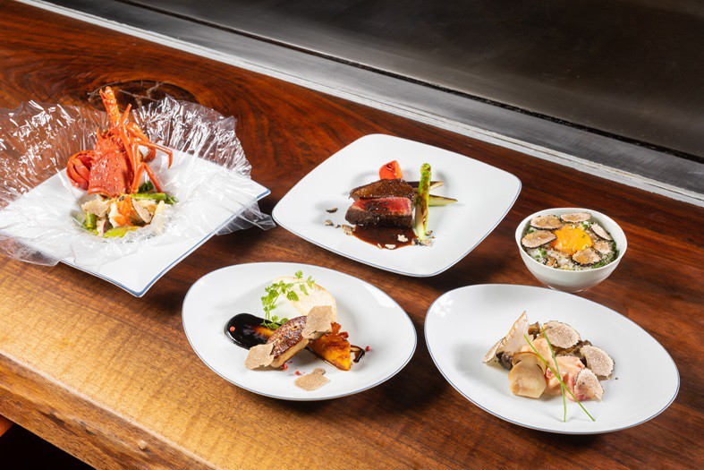 デザート以外すべてのコースに黒または白トリュフが使われており、まさにトリュフづくしのフルコース。目の前の鉄板で調理される食材が放つ芳香もさることながら、最後にシェフがスライスするその瞬間にぶわっと香るトリュフに悶絶すること間違いなし!
