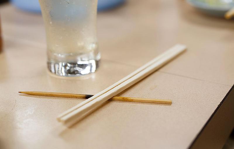 「同じように困るのが、箸の置きどころ。居酒屋は箸袋や取り皿がないケースも多いんですが、テーブルに直置きするのもなんだし……というとき、酒飲みの師匠である吉田類さんに教えてもらったのがこれ。まず焼き鳥とか串揚げとか串ものを一品頼んだら、その食べ終わった後の串を箸置き代わりに活用します。