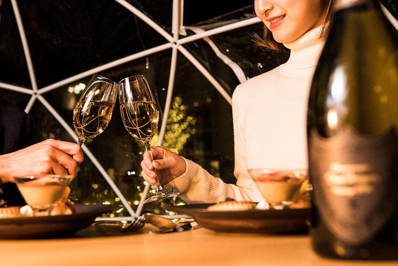 今回のディナープランは、このテラスを1日3組限定で完全貸切! ホテルのロビーで待ち合わせをして、スマートに連れ出してくれるだけでもサプライズ演出ですよね。宝石箱をひっくり返したかのようなきらめく東京を一望できる空の下で、まるで“かまくら”なドーム型イグルーにおこもりしながら、美酒と高級食材を惜しみなく使用したスペシャルディナーを堪能できるという、前代未聞の贅沢でロマンティックなクリスマスサプライズが用意されています。