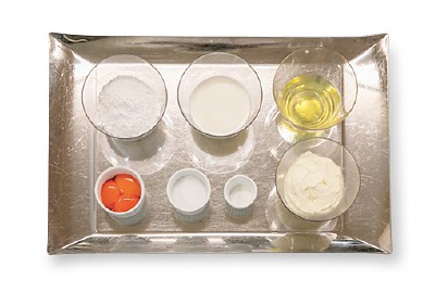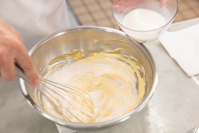 ボウルに卵黄、マスカルポーネを入れて均一になるように混ぜ合わせたら牛乳を加え、ダマにならないように気をつけながらよく混ぜる。さらに米粉、ベーキングパウダー、塩を加えて、混ぜ合わせる。