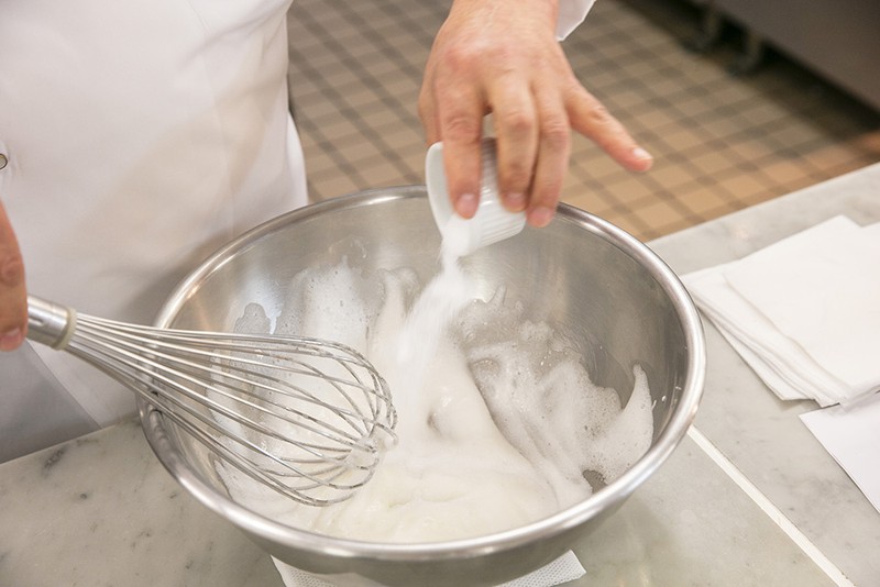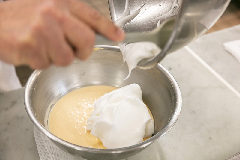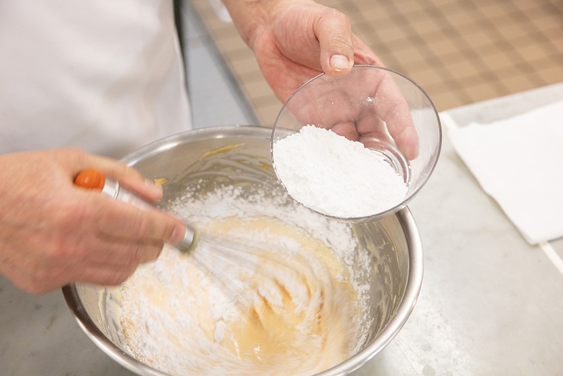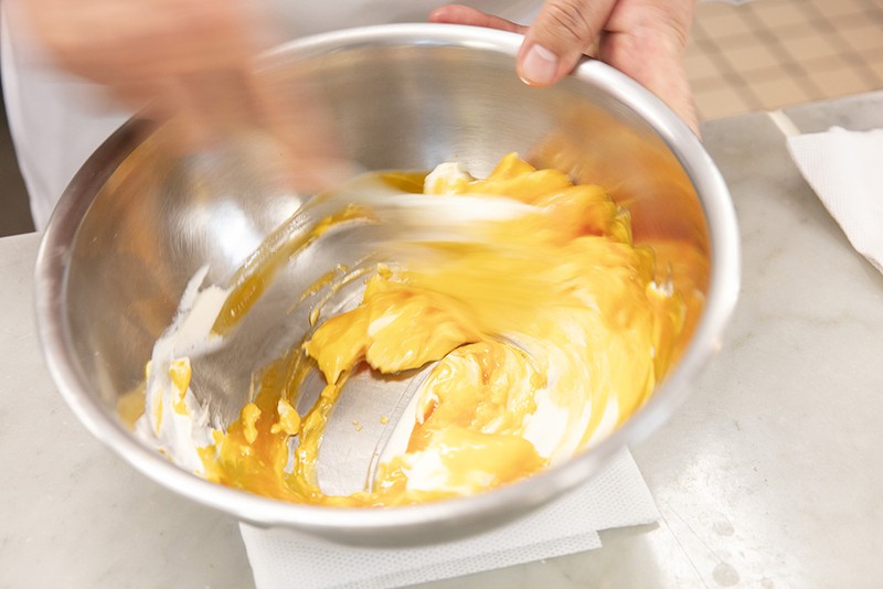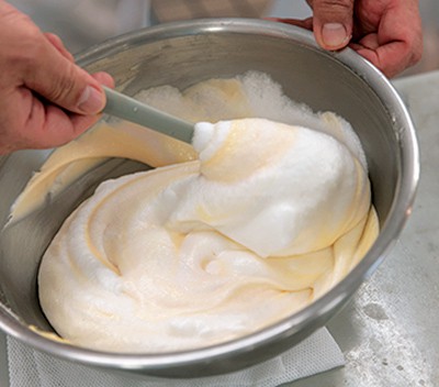 別のボウルで卵白を泡立てる。角が少し立ってきたのを確認してからグラニュー糖を加え、さらに泡立ててキメの細かいしっかりとしたメレンゲを作る。次に【1】と合わせ、ゴムベラなどで切るように全体を混ぜ合わせる。