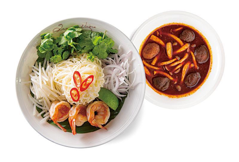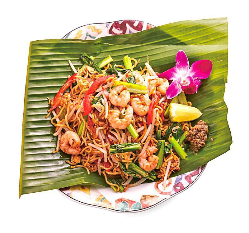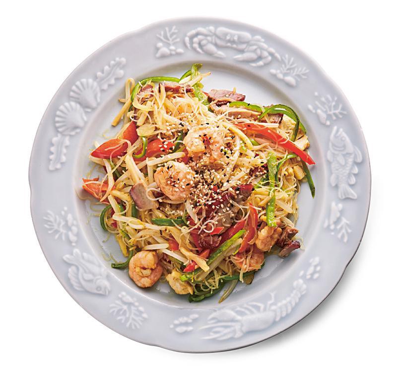 「シンガポールヌードル」は、エビ、チャーシュー、鶏肉、パプリカなどの具材とビーフンを秘伝の辛味スパイスとともにカレー風味で炒めた人気メニューです。