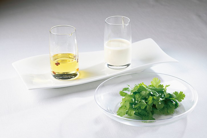 豆乳、山椒オイル、香菜で味変が楽しめます。