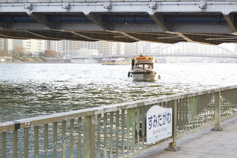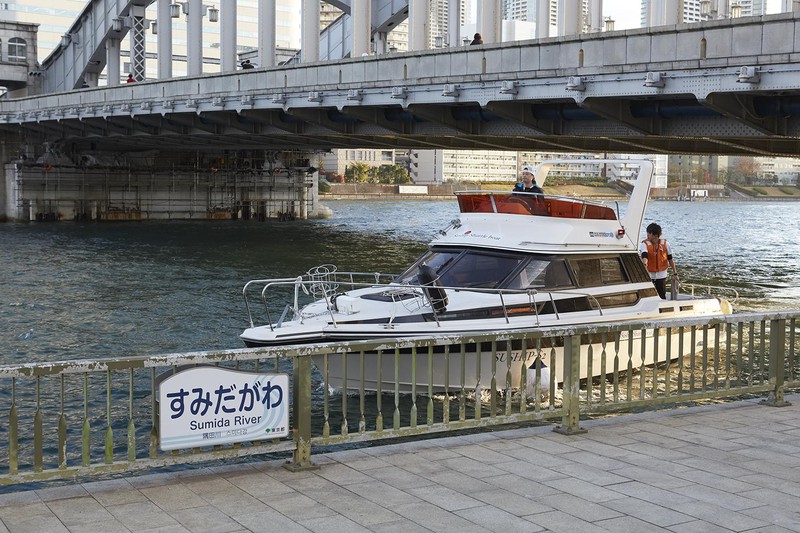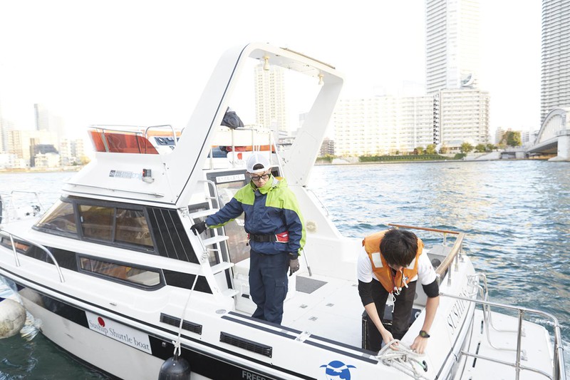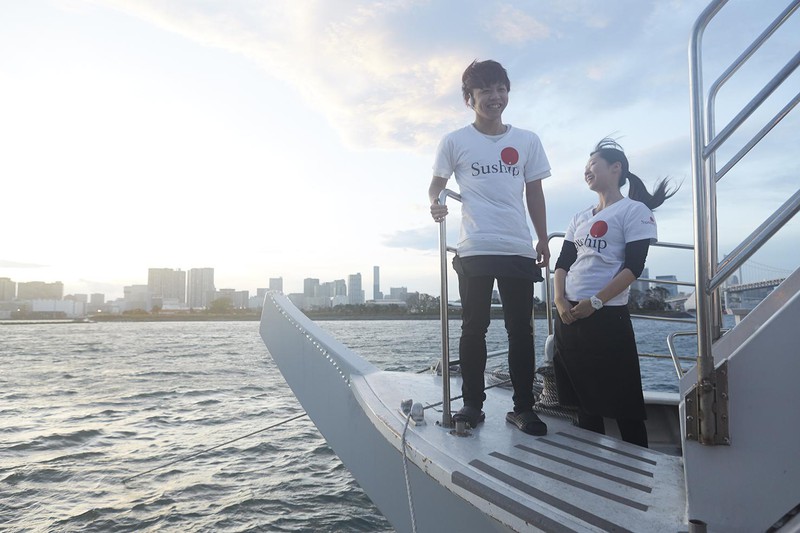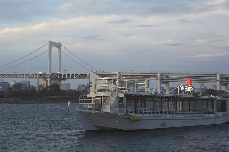 あっという間にネタバレしてしまったかと思いますが、この「SUSHIP」へ行くには隅田川から20分ほどシャトルボートに乗り、東京湾まで航海する必要があります。勝どき橋から、築地の市場跡を眺め、レインボーブリッジをくぐり抜けたら、目的地まではあっという間。屋形船は一斉スタートの時間に間に合う必要がありますが、「SUSHIP」は1時間ごとに予約できるので、食事のスタート時間を選べるのもうれしいポイント。