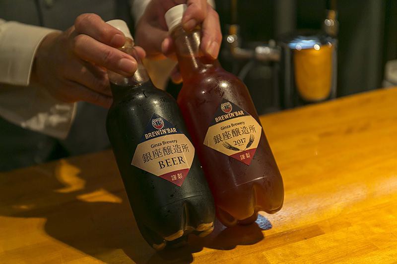 銀座のちょっとした手土産にとお持ち帰り用のオリジナルビールも用意。800円(500ml)。
