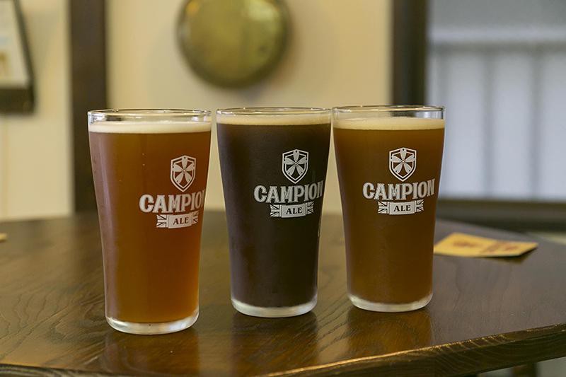 秋にオススメなのは、ビター(左)、ポーター(中)、ブラウン(右)の3種類。イギリスでは15~20度で提供されますが、「カンピオンエール」では日本の気候に合わせて8~9度前後で。いずれも1UKパイントで1000円。
