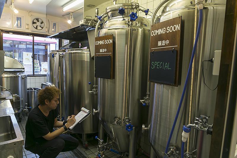 熟成中のエールの状態をチェックする、マネージャーの濱崎紘行さん。仕込みは週1回のペースで行っているそう。