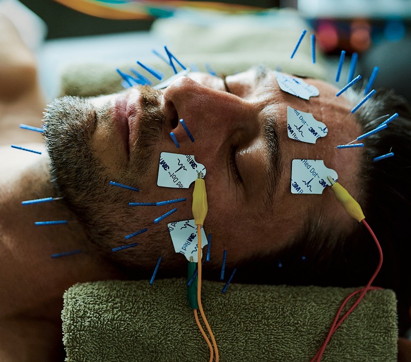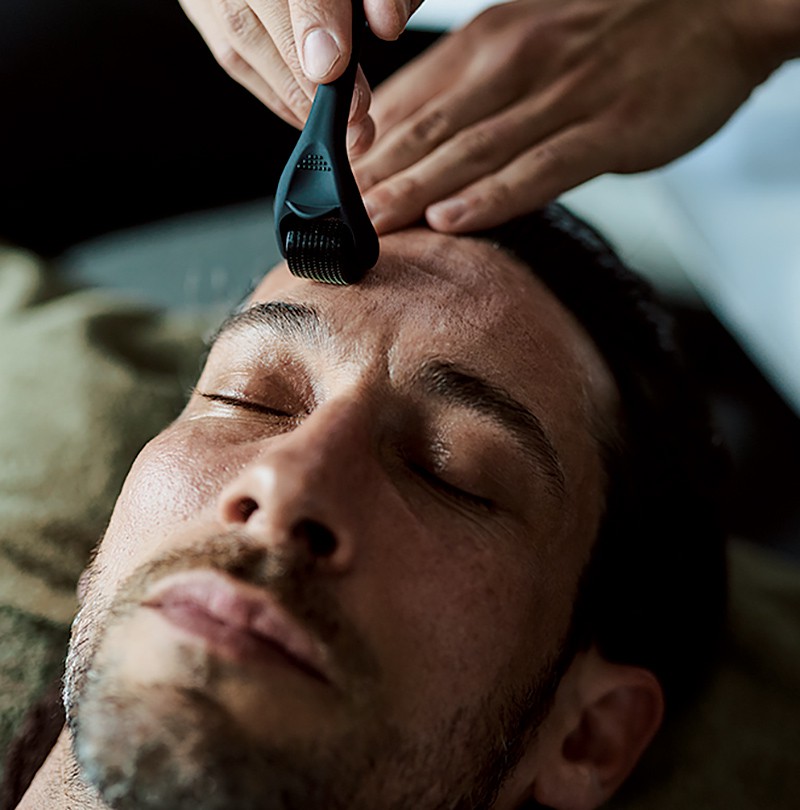 お疲れ顔をリフトアップしたり深いシワの改善に効く、男性の悩みに特化したコース。鍼と電流で顔筋にアプローチしたあとはローラーで肌表面に細かな傷をつけ、ヒト幹細胞培養液入り美容液とリフトアップ効果の高い天然の針入りクリームを塗り込むフル施術です。