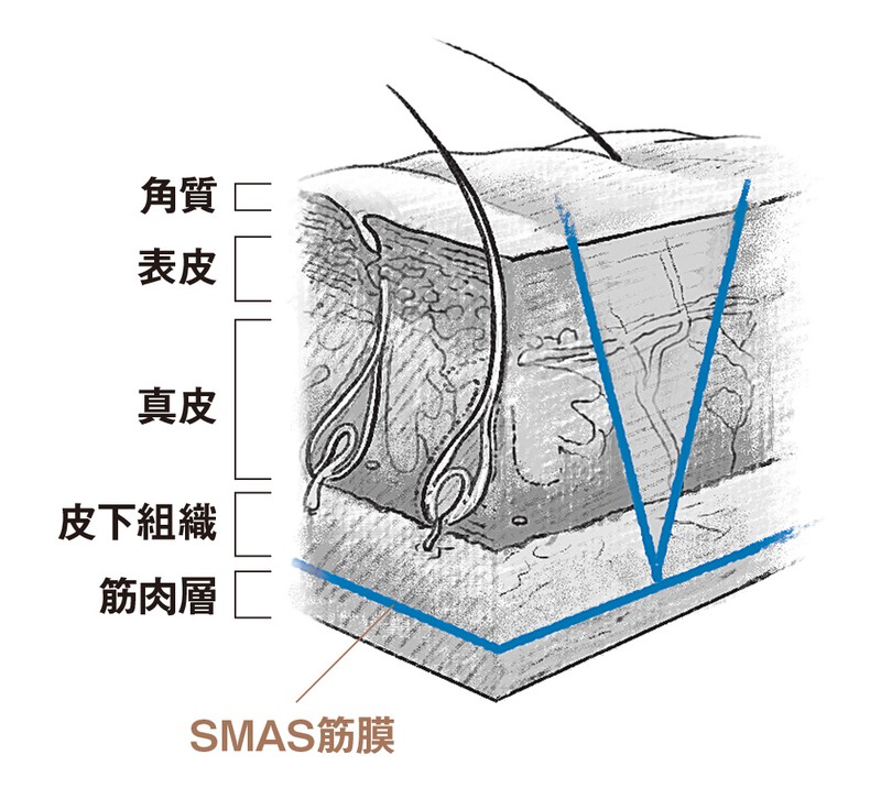 肌は角層、真皮、皮下組織、表情筋と何層にも分かれていて、特に表情筋と、表情筋につながるSMAS筋膜の衰えによって、たるみが起こります。ウルトラスキンアイリフトは、このSMAS筋膜にアプローチして、たるみを解消に導きます。