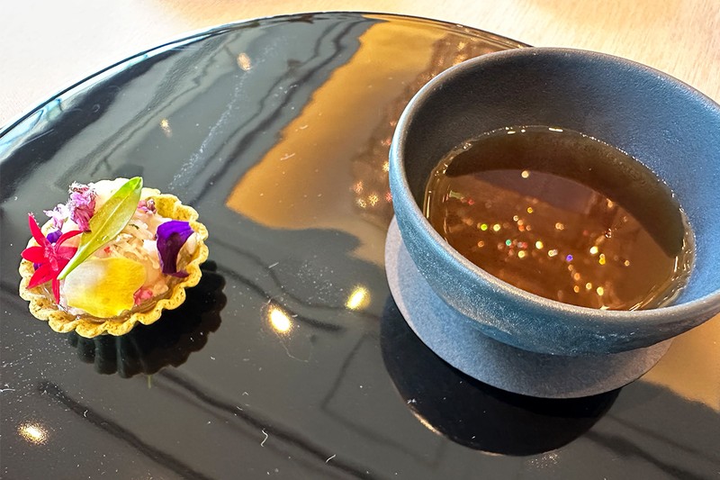 ▲ コース1皿目に登場するアミューズ ブーシュ「越前蟹とズワイ蟹のタルトレットクリュスタッセのコンソメ」。自家製タルトレットとコンソメスープには越前海老とズワイガニが使われていて、滋味深さがカラダ全体に広がります(パレスホテル東京 総料理長 齋藤氏による提供)。