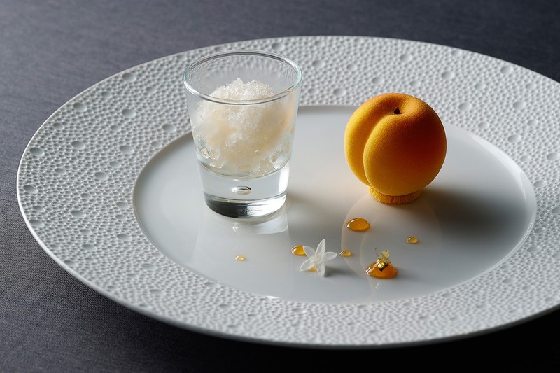 ▲ 最後のデザートは「Le jardin」のシェフパティシエ、工藤氏の作品。梅の形をしたスウィーツ「福井梅」は、福井梅を使ったムースとジュレをホワイトチョコレートでコーディングしたもの。黒龍酒造の梅酒に漬けた梅の果肉も入っています。左側のシャーベットは、ローズマリーと梅の風味でサッパリいただけます。