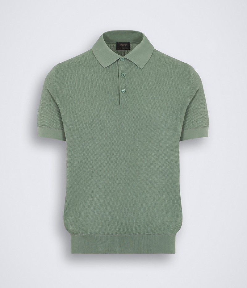 ▲ アクアグリーン×グレーのシーアイランドコットンで仕立てたポロシャツ。絹のようになめらかでしなやかな肌触りが、この上なくラジュアリーな印象。週末のお出かけにもぴったりです。12万9800円/ブリオーニ(ブリオーニ クライアントサービス)