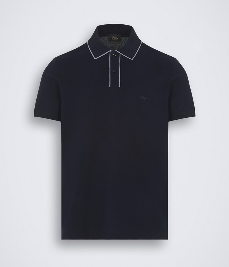 ▲ ニットの襟にマザーオブパールのボタンを配し、ロゴの刺繍を同系色で施したポロシャツ。コットンピケのさわやかな肌触りも快適です。8万5800円/ブリオーニ(ブリオーニ クライアントサービス)