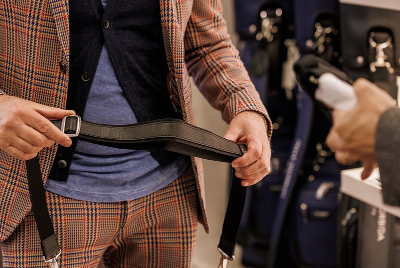 「パーティーシーンにおける男性のバッグって、これまでも正解がわかりにくいものでした。ならば、ということで考え抜いた結果、たどり着いた答えのひとつが、レディスアイテムからヒントを得た完全別注のワンハンドルバッグです。