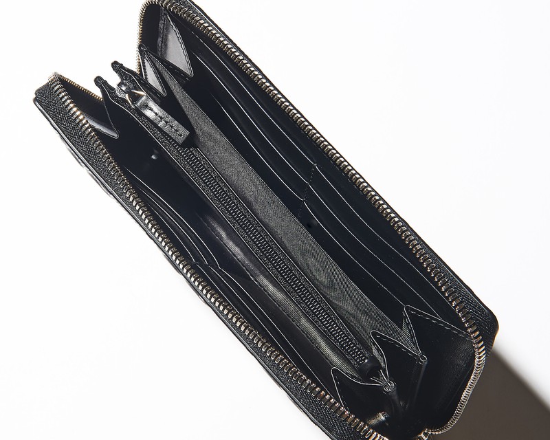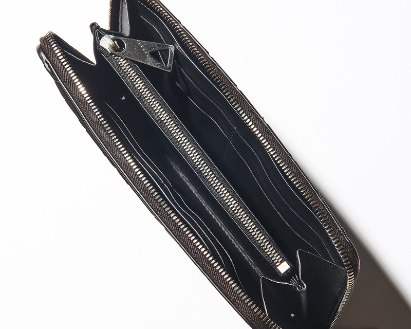 スムーズなカーフレザーのライニングには、カードスロットを8つ、マチ付きコンパートメントを3つ、ジップポケットを備えています。外装とは違ってオールブラックゆえ、シックな印象です。