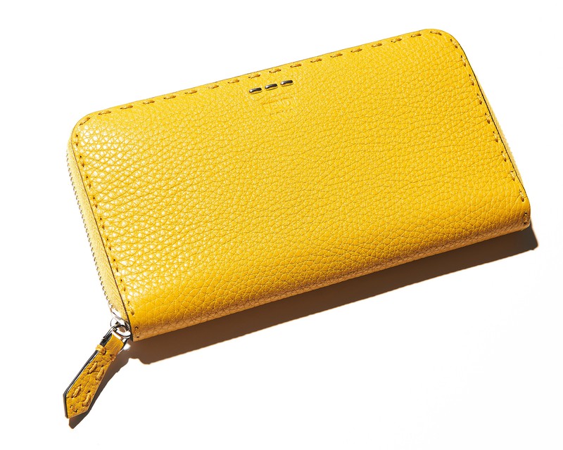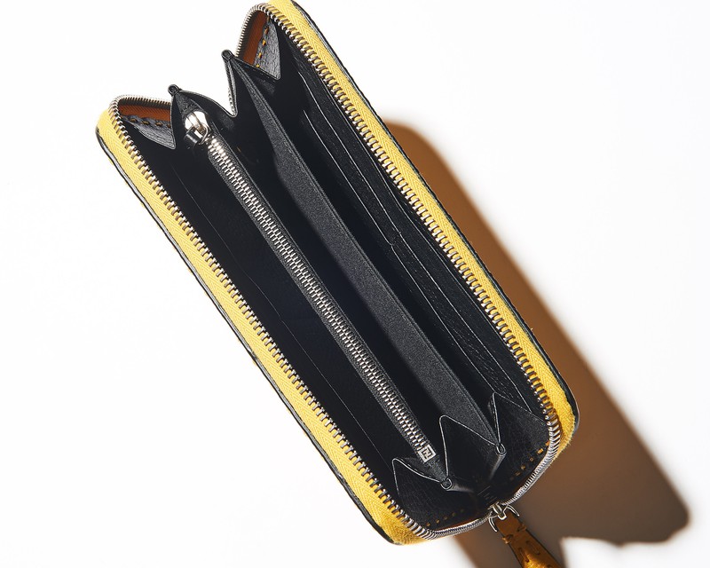 レザーとファーにおける卓越したクラフツマンシップを象徴する、手縫いのステッチがあしらわれたジップアラウンド財布。ポップでキャッチーなイエローは、クオイオ ローマと呼ばれる最高級カーフレザー。分かる人にだけ分かるアイコンとしてあしらわれた、パラジウム仕上げのメタルステッチも大人の物欲を刺激します。