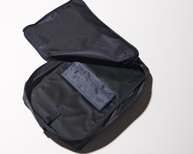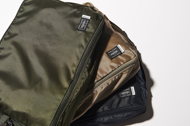 素材は弱撥水加工を施したナイロンツイルを採用。カラーは(左から)グリーン、グレーベージュ、ネイビーの全3色展開です。フライトジャケットなどのミリタリーウェアを思わせる、ナイロンの光沢や質感に胸躍る方もきっと多いのでは? 目を凝らすと、本体とジッパーの配色にこだわっているなどなど、細部にまで抜かりがありませんよね。