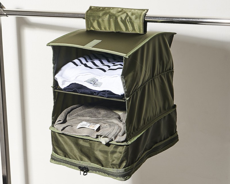 こちらがオープンして、クローゼットに吊り下げた状態。これなら、自宅であれ、旅先であれ、衣類を探す手間が省けて大助かりですね。そして注目はボトム部分。折り畳んであった状態の表側をクルリと裏返すと、一番下に、もうひとつ簡易的な収納スペースが確保できるってわけ。とにかく無駄のない設計には脱帽させられます。