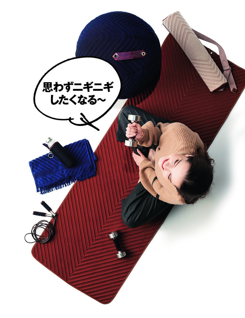 バランスボールのカバーやマットはもちろん、ウエイトや縄跳びのハンドル部、ボトルホルダーにまでカシミアを使用。ボール24万5000円、マットセット25万9000円、ウエイトセット25万9000円、ボトル&ホルダー6万2000円、縄跳び8万2000円、タオル2万1000円、女性●ニット27万2000円、パンツ26万3000円/すべてロロ・ピアーナ(ロロ・ピアーナ ジャパン)