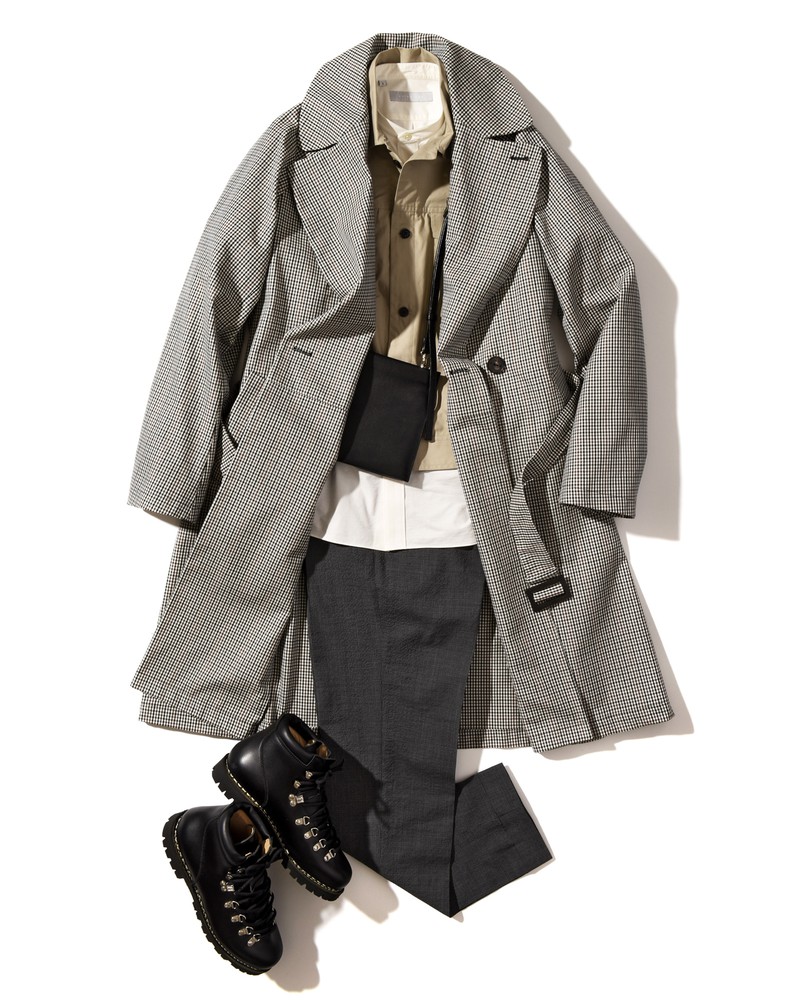 それを簡単に解決してくれるのが、ぺちゃんこショルダーバッグです。いわゆるサコッシュ型のバッグで、自転車競技において走行中の選手に補給食や飲み物を手渡すための簡易的なバッグがベース。出自がアクティブだから、コートの中にアクセ感覚で合わせるだけで、軽快な印象を与えてくれます。手ぶらもできて実用的ですしね。