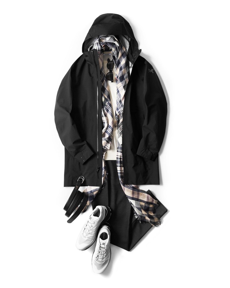 そこでオススメなのが、アウトドアアウターをメインとした着こなしにドレッシーなアイテムを加える、というテクニック。これだけで即座に都会的かつ大人っぽい雰囲気が手に入りますので、ぜひお試しを。