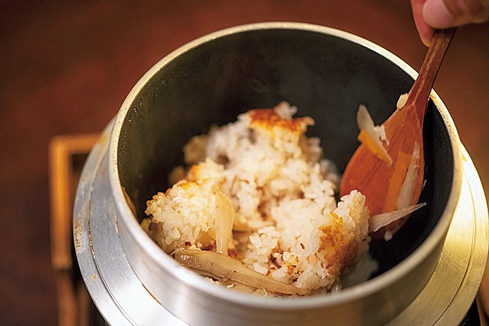旬の素材を活かした釜炊きごはん。写真は、鮭とゴボウの炊き込み。お焦げがまた美味しい。