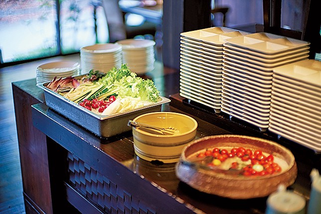 朝食では、旬の野菜をビュッフェ形式で提供してくれる。新鮮で旨味たっぷりの野菜をもりもり食べられるのがうれしい。