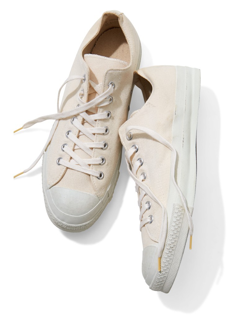 ご覧のようにデザイン自体はコンバース社の定番=オールスターのローカットの白ボディとほぼ変わらないのだが、ベロやかかとに付くはずのALL STARの文字や、インソール中央に入るはずのメーカー名、サイドのラインまでもがまったく付かない。