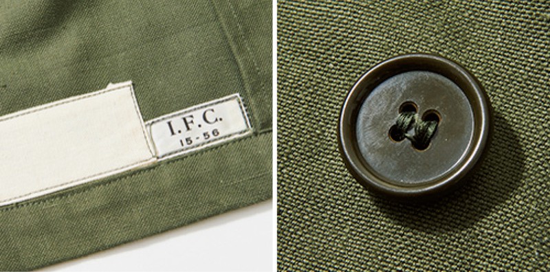 M38の名前のとおり1938年に登場し、1950年代まで製造されていたのだが、私が所有するのは、ザックリとしたモスグリーンのコットンキャンバス生地製で、竹を削り出して作ったボタンが付属する最初期のタイプ。表面に糸穴のないバンブーボタンがサイボーグ009感を余計に醸し出しているが、50年代に近い後期モデルになると、ボタンは四つ穴の樹脂製となる。素材もキャンバス生地が少しなめらかになり、色目も緑が濃くなるが、基本その佇まいは変わらない。